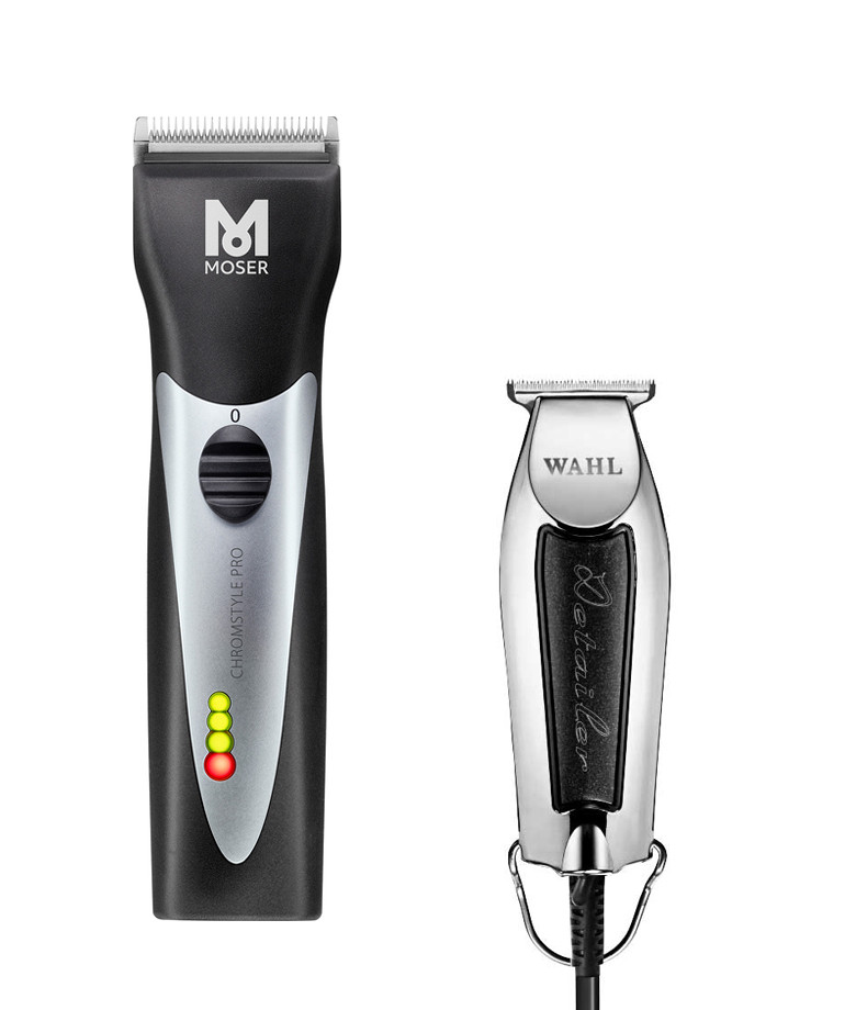 Hledáte ideální střihací strojky pro práci v kadeřnickém salonu? Vyzkoušejte naše osvědčené univerzální duo strojků se kterými neuděláte chybu - Moser Chromstyle a kontura Wahl Detailer.