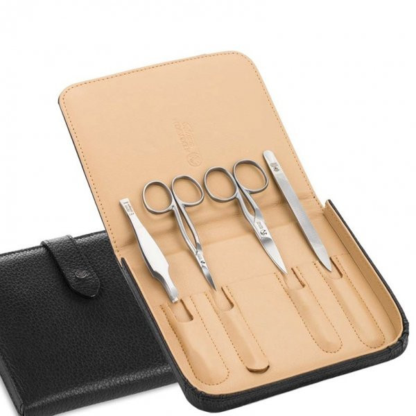 Manikúra DOVO Solingen 2038 016 R SAT. je exkluzivní sada nerezových nástrojů nejvyšší kvality. Součástí je pouzdro vyrobené ze dvou kůží - vnější černá z buvolí kůže a vnitřní béžová z himalájského jaka, s patentním knoflíčkem na zapínání a logem DOVO Solingen. Nástroje zahrnují nerezové nůžky na nehty s mikroozubením na jedné straně ostří, zahnuté a s matným povrchem (R SAT.), nerezové nůžky na kůžičku s úzkou a velmi pevnou špičkou a matným povrchem (R SAT.), nerezovou rozšířenou pinzetu se šikmým zakončením a precizně zabroušený ocelový nerezový pilník. Výrobek je originální a pochází ze Solingenu v Německu.