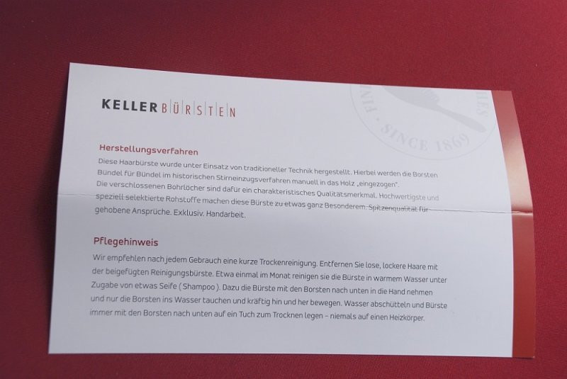 Německá rodinná firma Bürstenfabrik Keller GmbH byla založena v roce 1869. Patří mezi přední evropské výrobce v oboru. Zkušenosti společnosti se odráží zejména v designu výrobků, výběru použitých materiálů a složení sortimentu. V široké nabídce najdete kulaté dřevěné foukací kartáče, ploché dřevěné kartáče s přírodními štětinami, ploché a kulaté plastové kartáče s polyamid. štětinami. Firma Keller reflektuje požadavky kladené na výrobky v 21. století s větší orientací na zákazníka. Vysokou prioritou firmy jsou ekologické a etické principy, od roku 2008 jsou držitelé certifikátu FSC®.