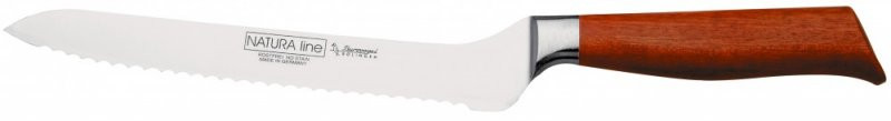 Držadlo nože je ergonomické a vyrobeno z výběrového palisandrového dřeva, což dodává noži velmi estetický vzhled a zajišťuje pohodlný úchop při práci. Délka ostří nože je 20 cm, což je ideální pro krájení různých druhů pečiva.