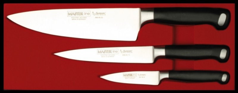 Souprava nožů BURGVOGEL Solingen - MASTER LINE 9350.951.00.0 je exkluzivní 3 dílná souprava nožů s výkovekem z jednoho kusu nejvyšší kvality nerezové chrom-molybdenové oceli X50CrMoV 15. Nože mají ergonomické a velmi estetické držadla, které perfektně padnou do ruky.