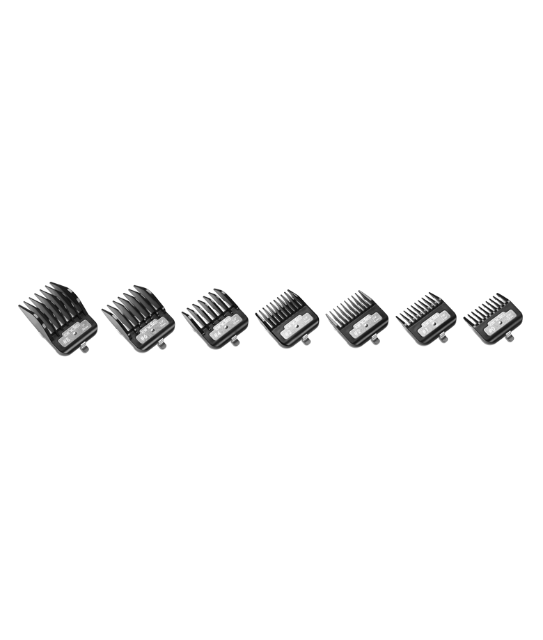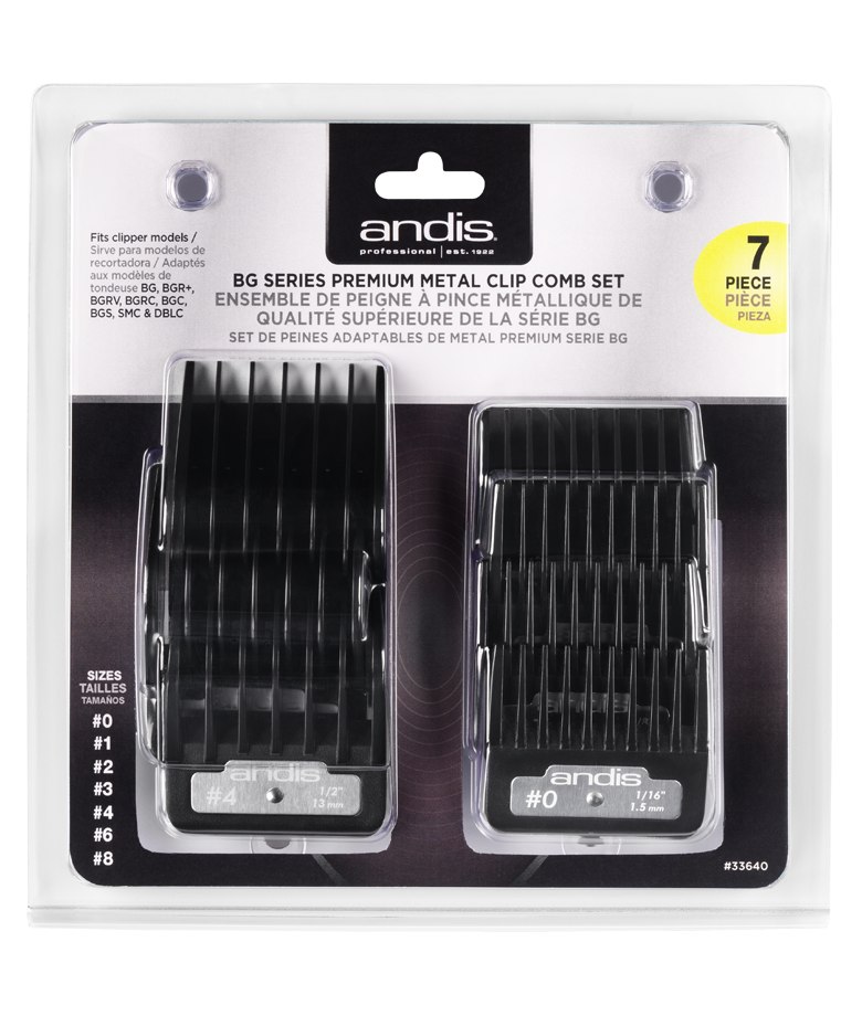 Sada kvalitních plastových hřebenů Andis s kovovou sponou BG Series Premium Metal Clip je balení obsahující 7 kusů hřebenů vhodných pro střihací strojky řady BG, BGR+, BGRV, BGRC, BGC, BGS, SMC a DBLC. Tyto hřebeny jsou vyrobeny z kvalitního plastu, který je odolný proti poškození a mají kovovou sponu, která je pevná a zajišťuje, že hřeben drží na strojku bezpečně a pevně.