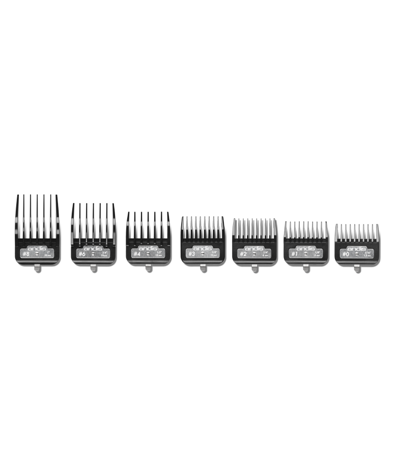 Sada obsahuje hřebeny v černé barvě a v různých velikostech: #0 - 1,5 mm, #1 - 3 mm, #2 - 6 mm, #3 - 10 mm, #4 - 13 mm, #6 - 19 mm, #8 - 25 mm. Tento široký rozsah velikostí umožňuje snadné a přesné nastavení požadované délky vlasů při stříhání. Sada kvalitních plastových hřebenů Andis s kovovou sponou BG Series Premium Metal Clip je skvělou volbou pro profesionální kadeřníky i pro běžné používání doma. Díky vysoké kvalitě zpracování a použitých materiálů jsou tyto hřebeny velmi odolné a poskytují přesné a pohodlné stříhání vlasů.