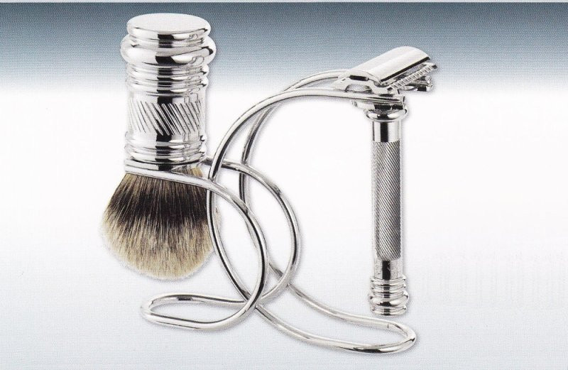 Samostatný elegantní stojánek na holicí žiletkový strojek MERKUR Solingen (krátké i dlouhé držadlo) a holicí štětku. Stojánek má chromovaný a leštěný povrch. Tento stojánek je vyráběn v Solingenu v Německu firmou DOVO/MERKUR Solingen.